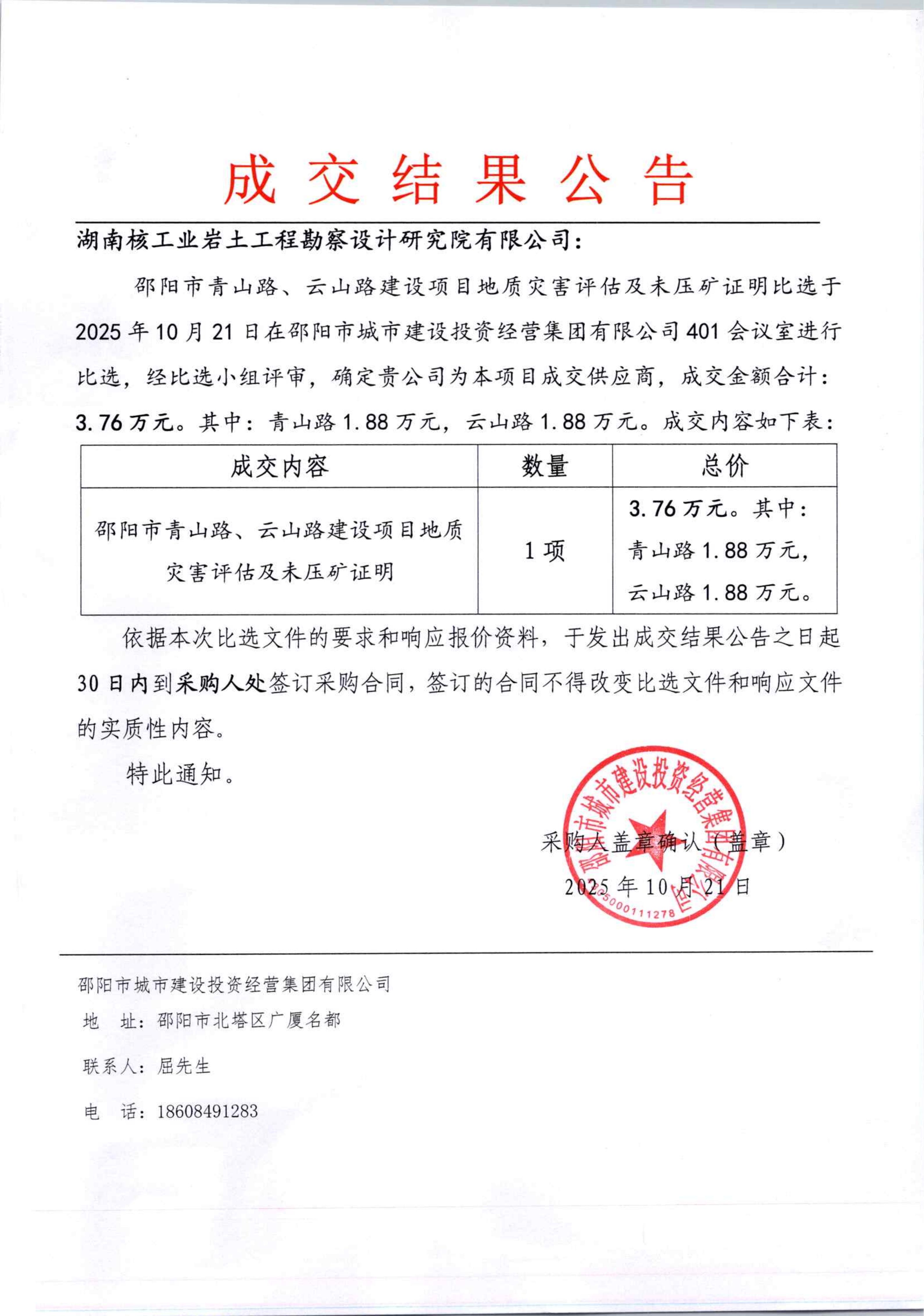 青山路、云山路建設(shè)項目地質(zhì)災(zāi)害危險性評估及未壓礦證明比選成交結(jié)果公告