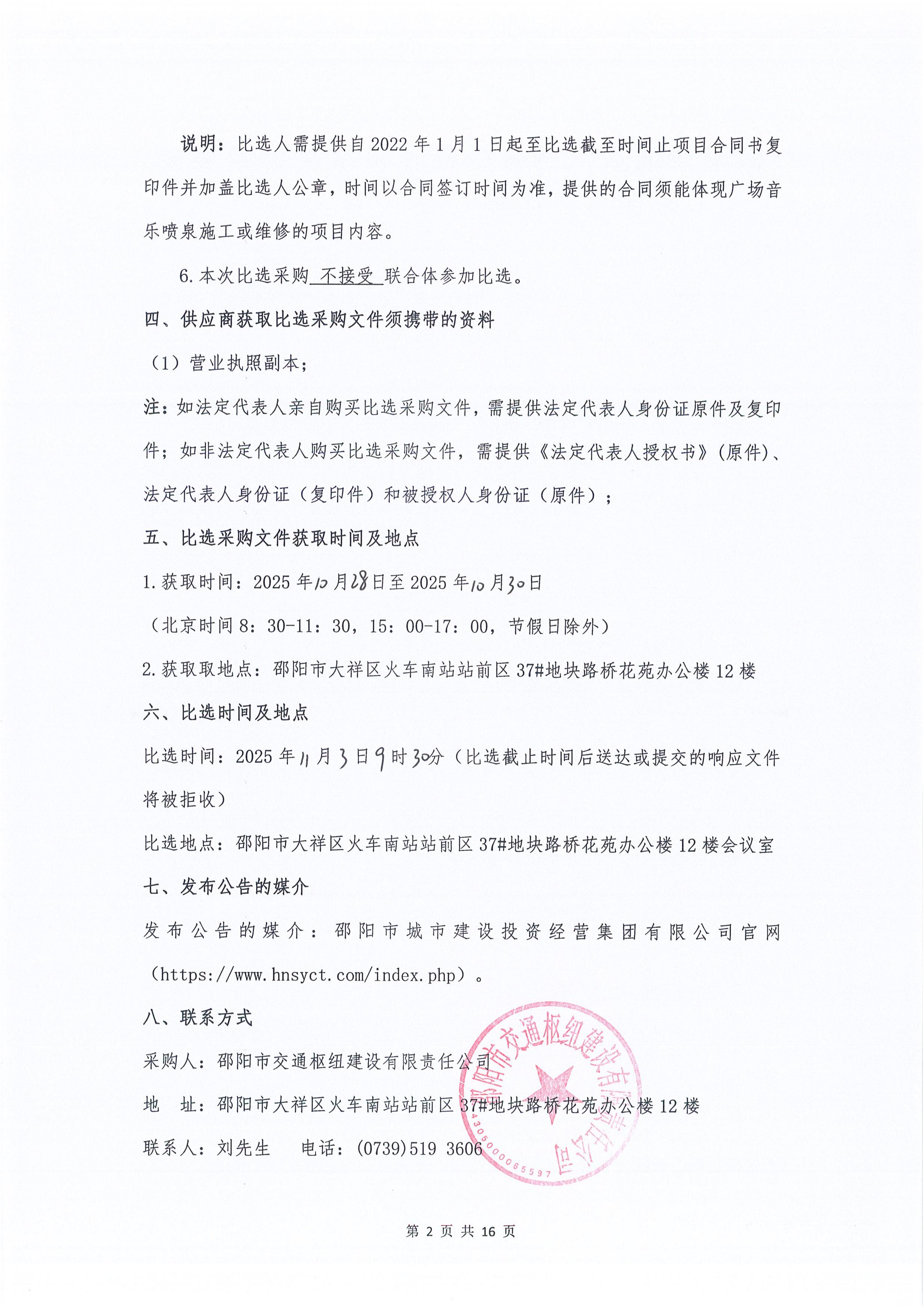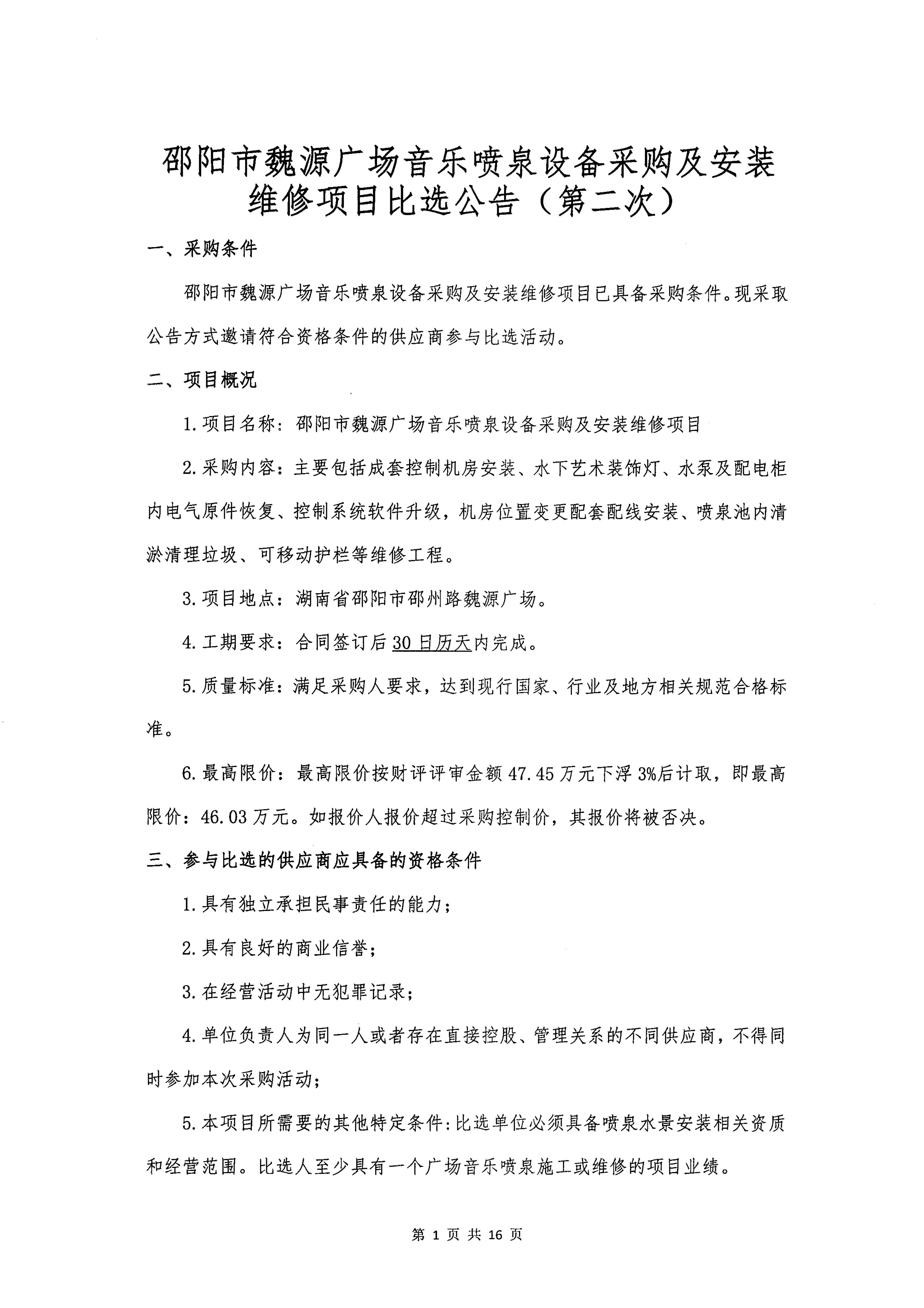 邵陽(yáng)市魏源廣場(chǎng)音樂(lè)噴泉設(shè)備采購(gòu)及安裝維修項(xiàng)目比選公告(第二次)