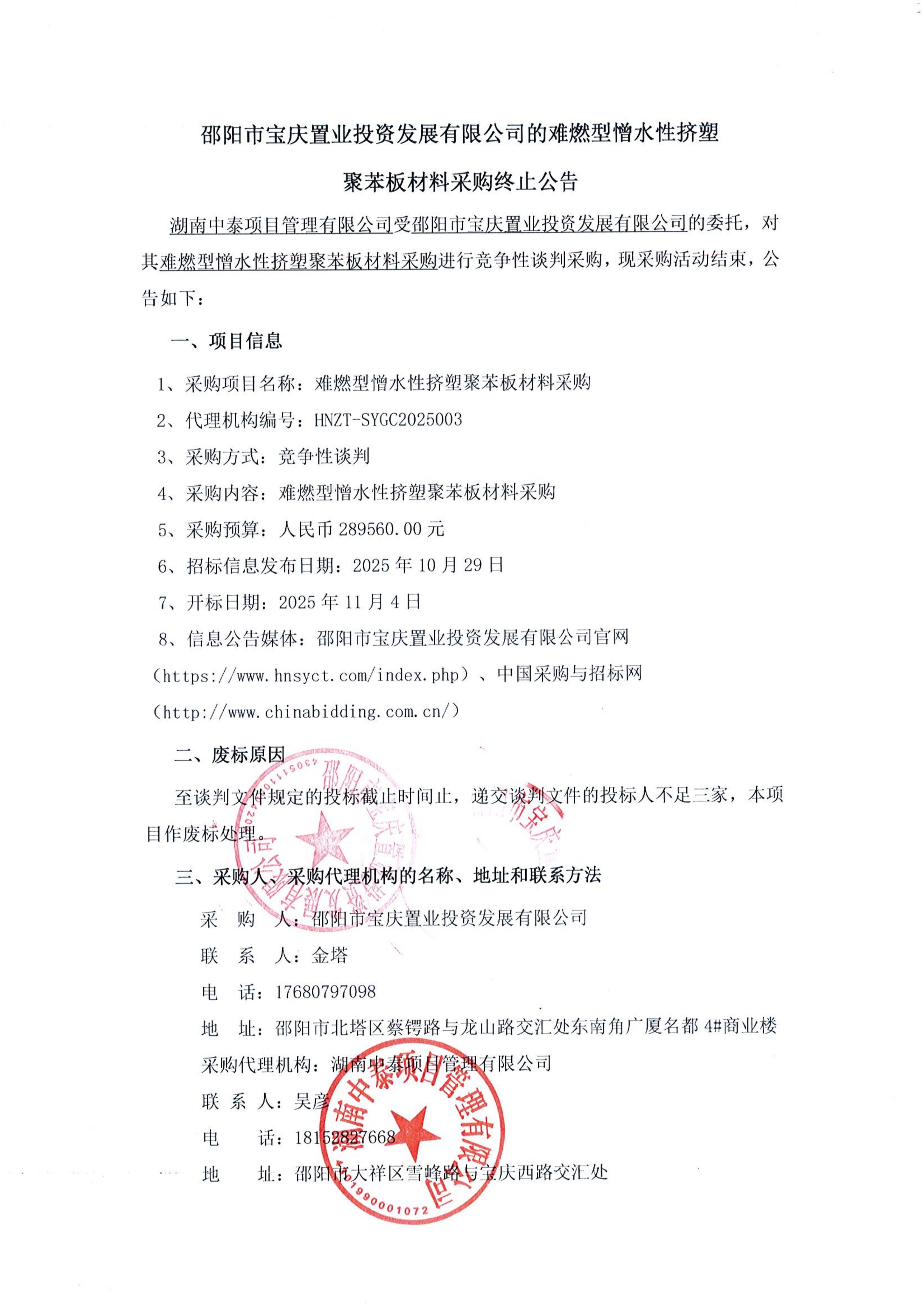 難燃型憎水性擠塑聚苯板材料采購談判終止公告(第二次)..