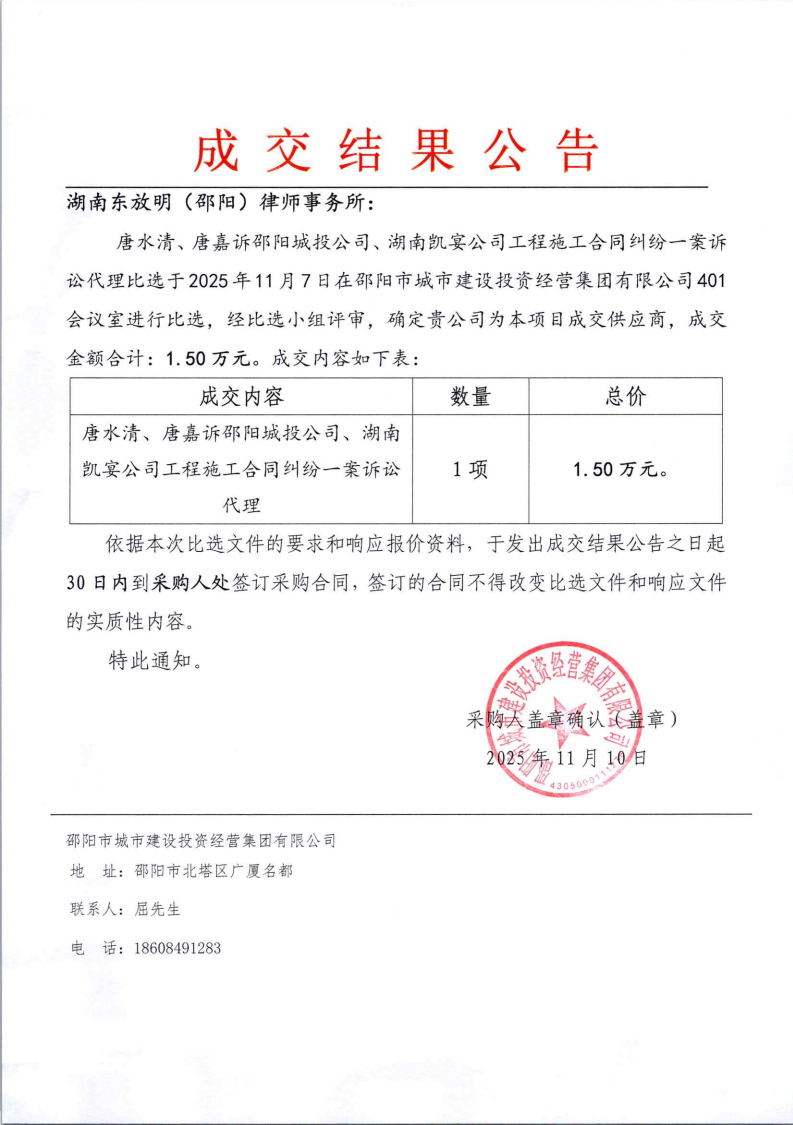 唐水清、唐嘉訴邵陽(yáng)城投公司、湖南凱宴公司工程施工合同糾紛一案訴訟代理比選成交結(jié)果公告